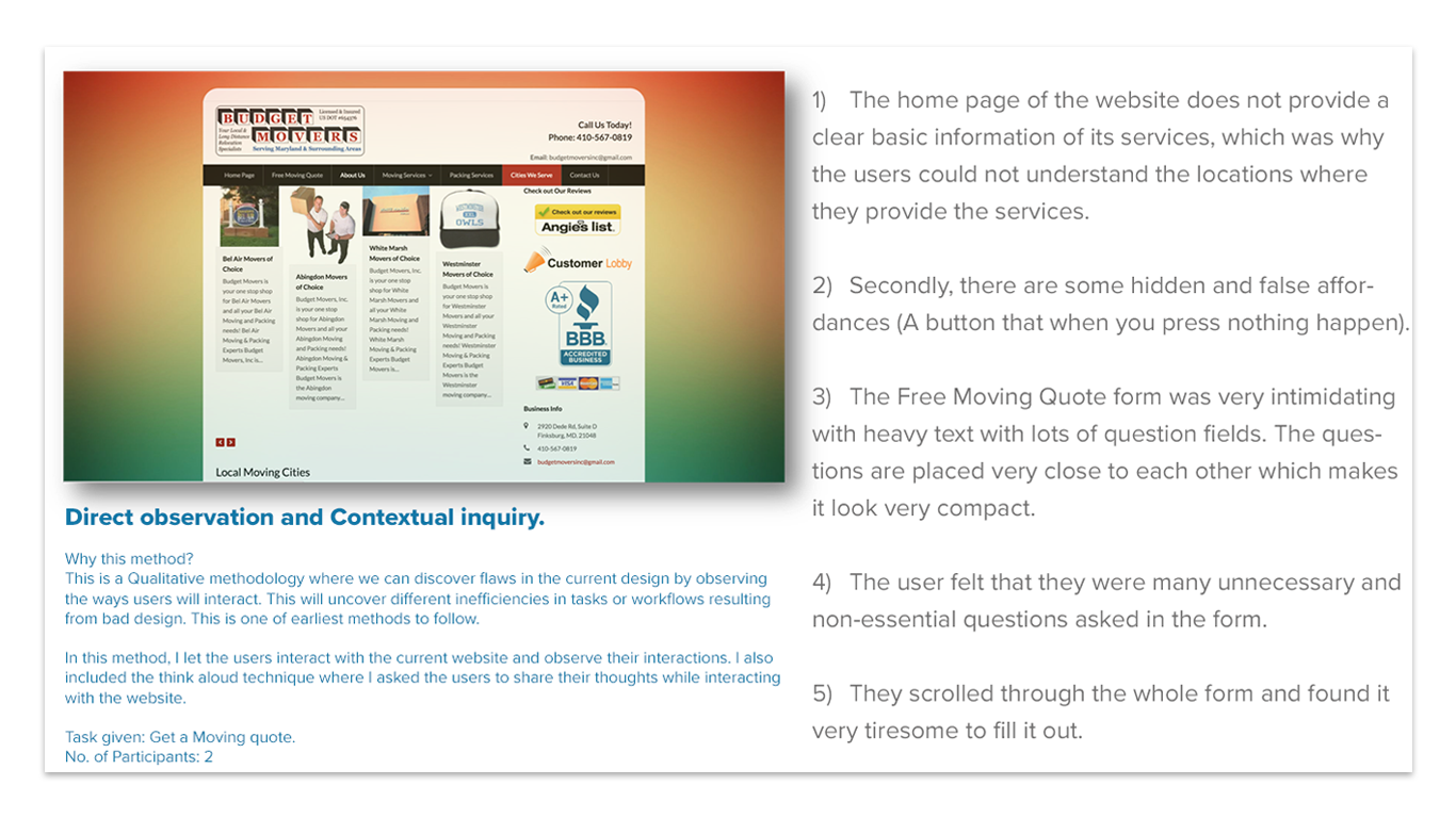 This project aims to explore different usability issues with the Budget Movers, Inc. Budget Movers is a Moving service company that services Maryland and surrounding areas. The scope of this project is to improve the user experience of scheduling the Move. Through this goal, the user will have a hassle free, transparent, and time saving Moving experience.
